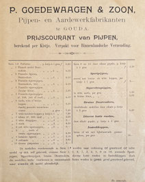 Blad (origineel) met prijzen van de ‘N.V. Goedewaagen’s Koninklijke Hollandsche pijpen- en aardewerkfabrieken, Gouda’. Verkorte prijscourant van Pijpen, waarop uitsluitend die soorten voorkomen, welke in Nederland het meest worden gebruikt. (Uittreksel uit de prijscourant van Catalogus No. 6). Met prijzen van lange en korte pijpen en asbakken. Verder nog reclame voor doorokers, baronite, houten en meerschuim pijpen. Ca 1920-1930.