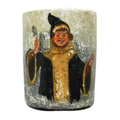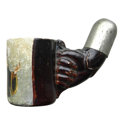 The pipe is shaped in the form of a hand holding a pipe bowl in the form of a beer mug. The sub stemmed pipe has a metal tube in which the separate pipe stem was placed. The front of the bowl has a multi colour image of a 'Münchner Kindl' holding a beer mug. The Münchner Kindl is the traditional symbol of Munich depicting a young, childlike person, originally a monk. During the 19th century the monk was replaced by a young woman dressed in a black and gold religious habit. This symbol has been traditionally associated with the city crest and is the official representation of the city, especially during the Oktoberfest.
